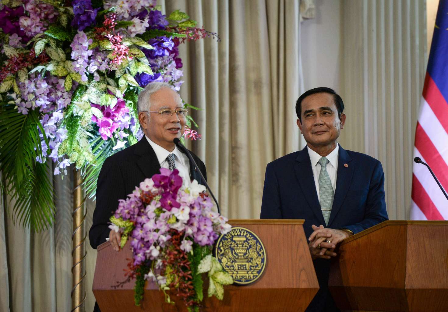 Malaysian Prime Minister Najib Razak(left) and Thai counterpart Prayut Chan-o-cha at a press conference at Government House in Bangkok.