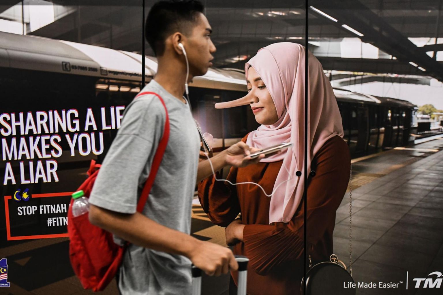 An advertisement with the slogan "sharing a lie makes you a liar" at a train station in downtown Kuala Lumpur on March 26, 2018.
