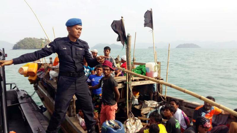 A Malaysian Maritime Enforcement Agency officer on a boat carrying Rohingya refugees on April 3, 2018, after it was intercepted off Langkawi.