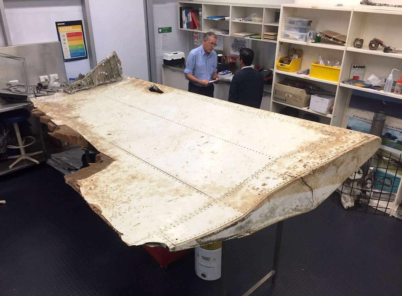 Australian and Malaysian officials examine aircraft debris found near Tanzania at the Australian Transport Safety Bureau headquarters in Canberra on July 20, 2016.