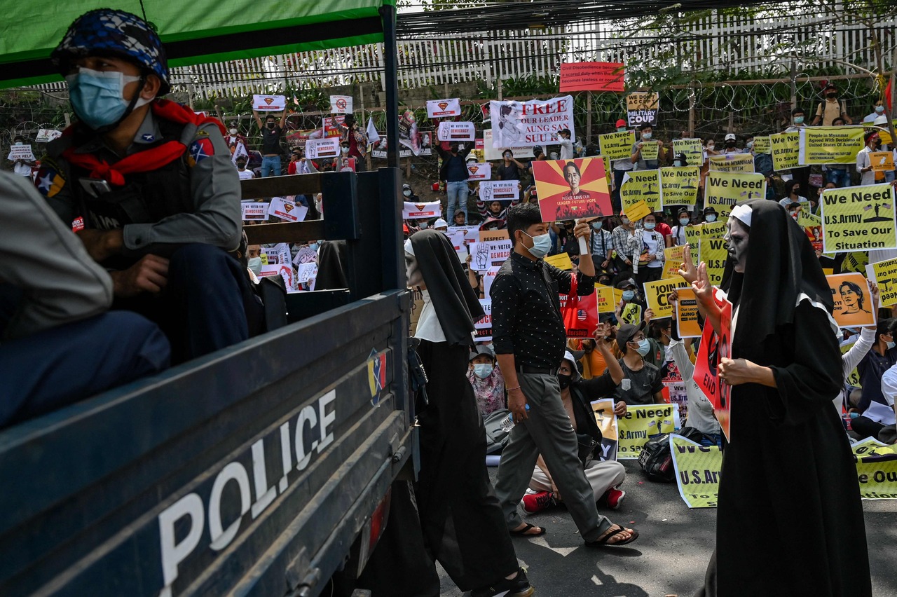 A photo from Feb 15, 2021, showing police officers in a truck as protesters hold a demonstration against the military coup in Yangon.