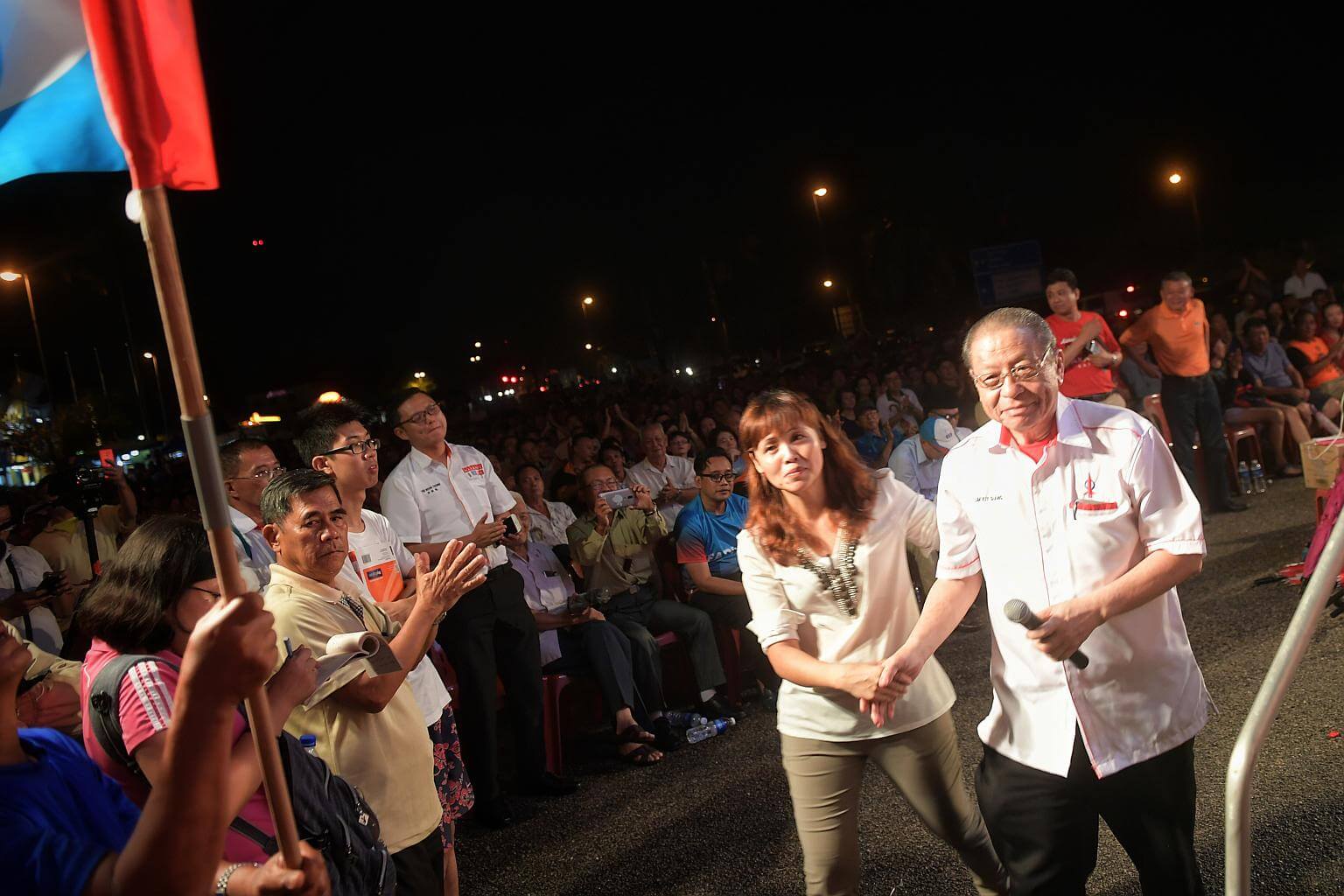 Democratic Action Party adviser Lim Kit Siang (right) being ushered to the stage at the Pakatan Harapan rally in Kulai, on April 20, 2018.