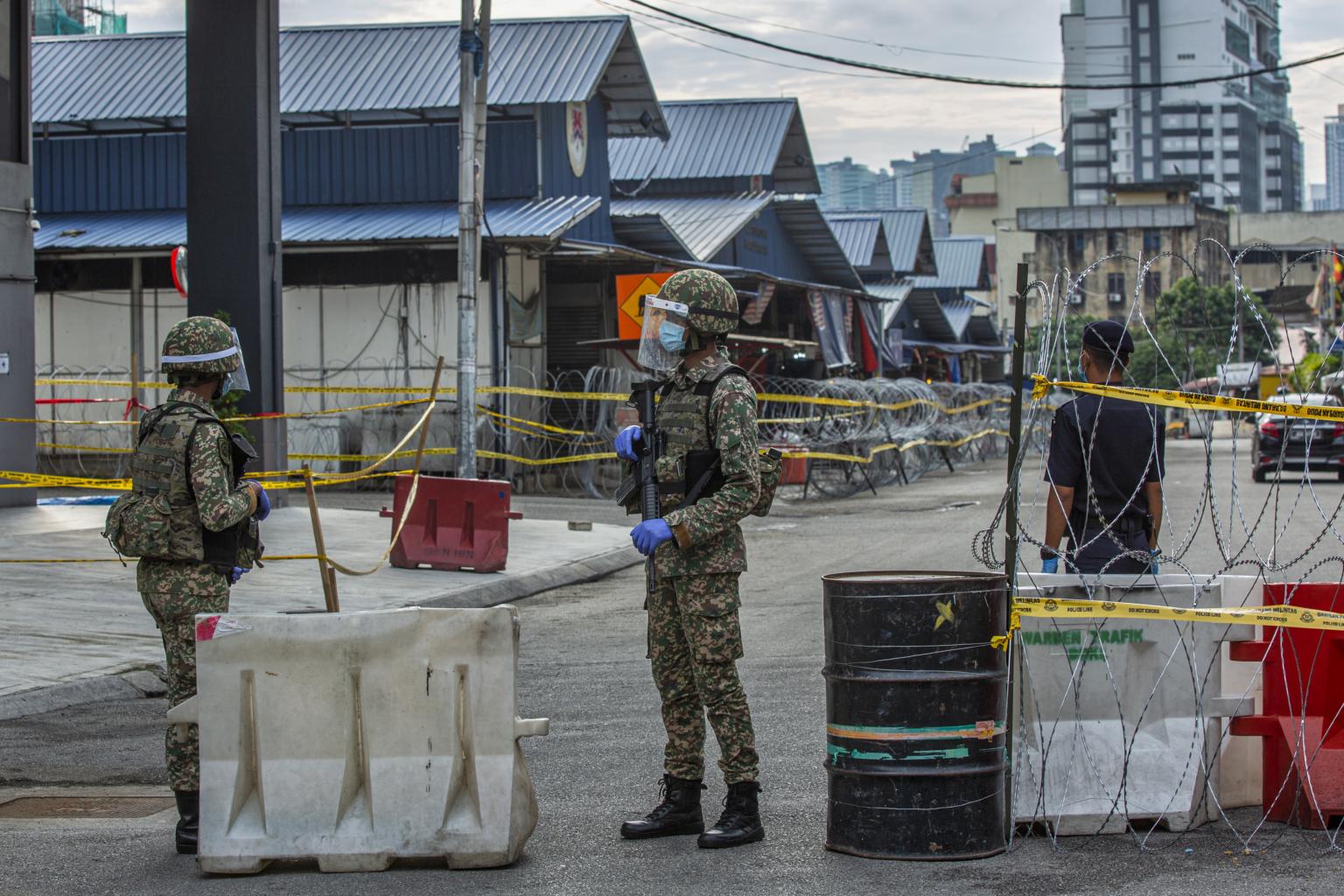 The Malaysian army guards the entrance to Raja Bot wet market in Kuala Lumpur on May 6, 2020.