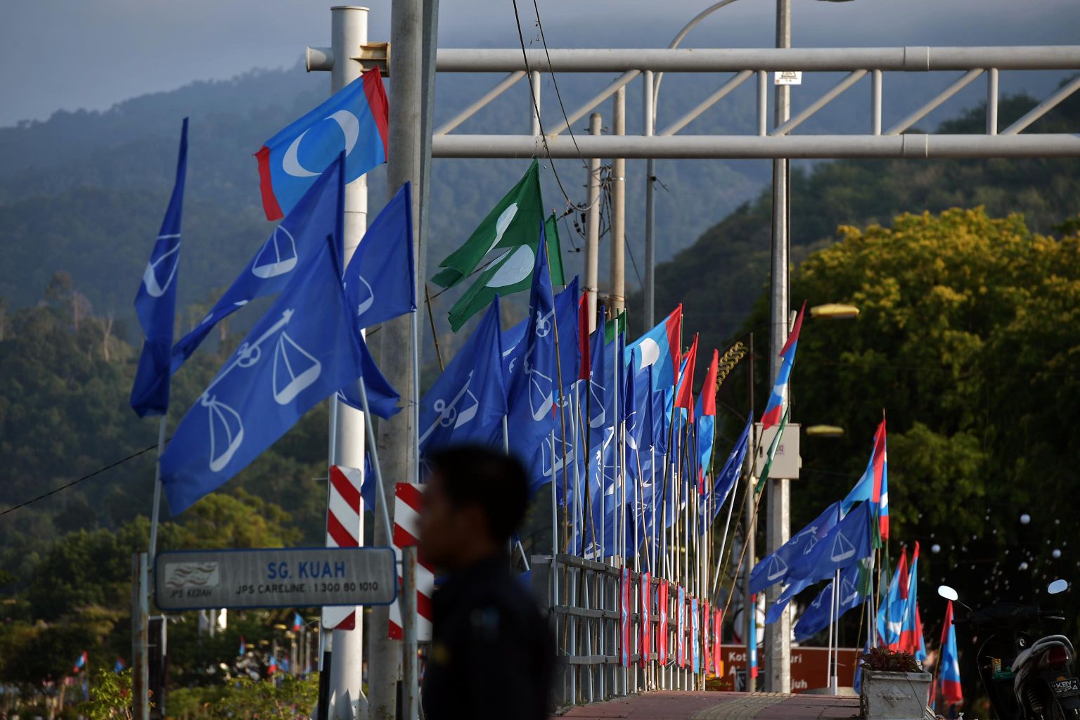 Party flags on display on Nomination Day in Langkawi's main town, Kuah, on April 28, 2018.