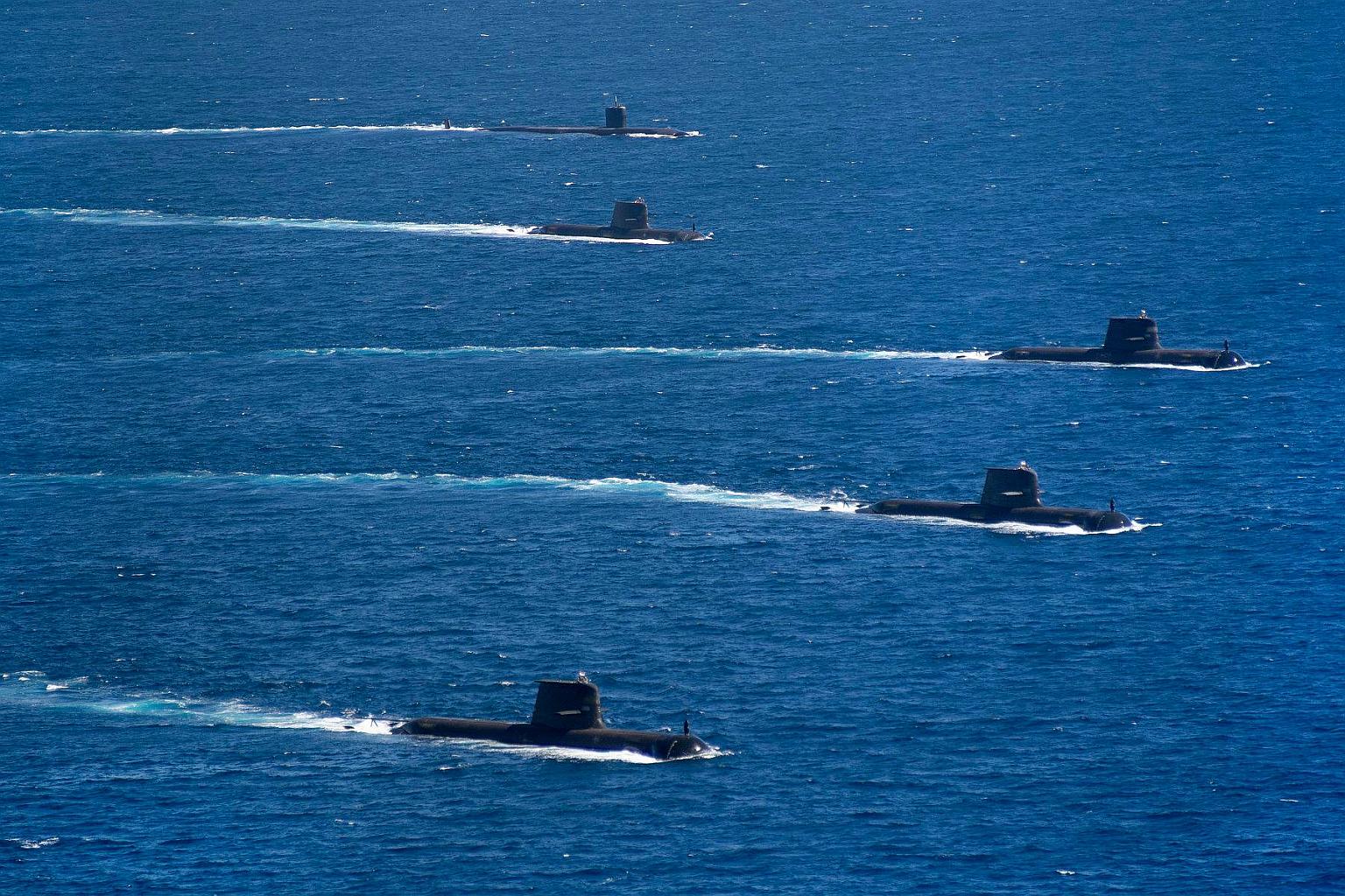 The USS Santa Fe (top) sailing in formation with Royal Australian Navy submarines HMAS Collins, HMAS Farncomb, HMAS Dechaineux and HMAS Sheean.