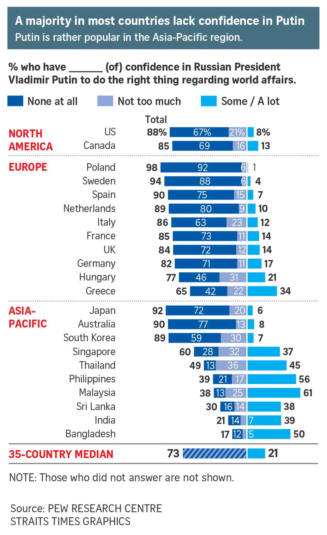 Still, overall, 60 per cent of Singapore respondents had little to no confidence in Mr Putin and 63 per cent of Singaporeans held an unfavourable view of Russia.