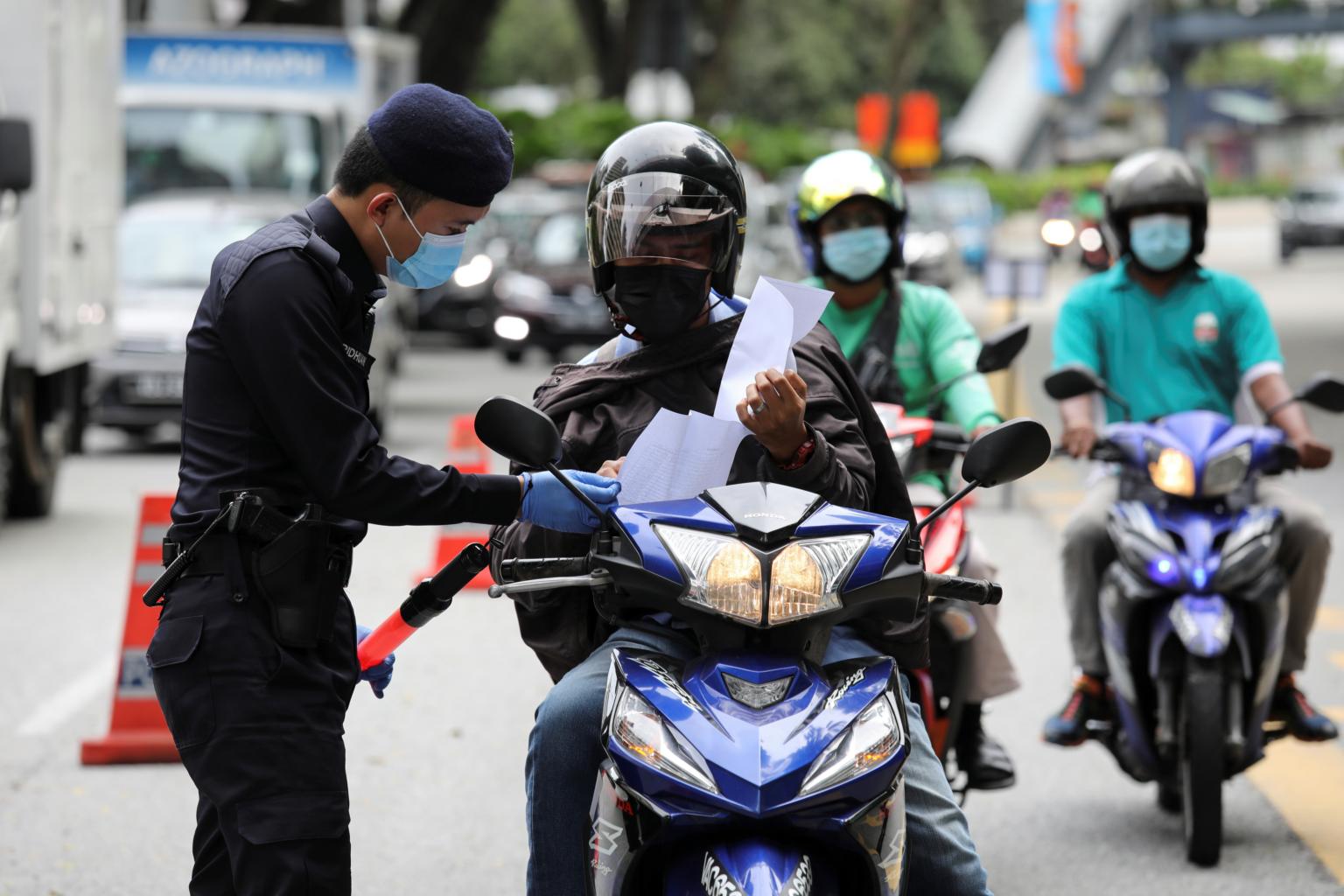 A police officer checks the documents of a rider at a roadblock in Kuala Lumpur, on Jan 13, 2021.