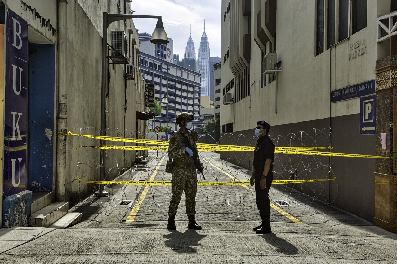 Malaysian enforcement officials guard the street in Kuala Lumpur, Malaysia, on April 15, 2020.