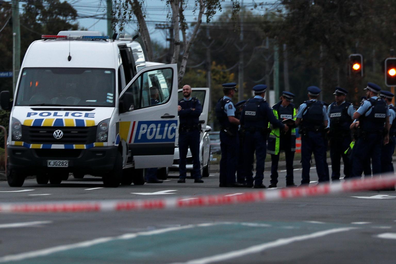 Police officers gather outside Linwood mosque after shootings in Christchurch, New Zealand, on March 16, 2019.