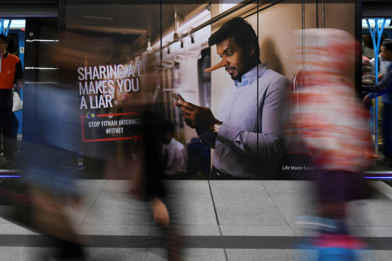 Commuters walk past an advertisement discouraging the dissemination of fake news at a train station in Kuala Lumpur.