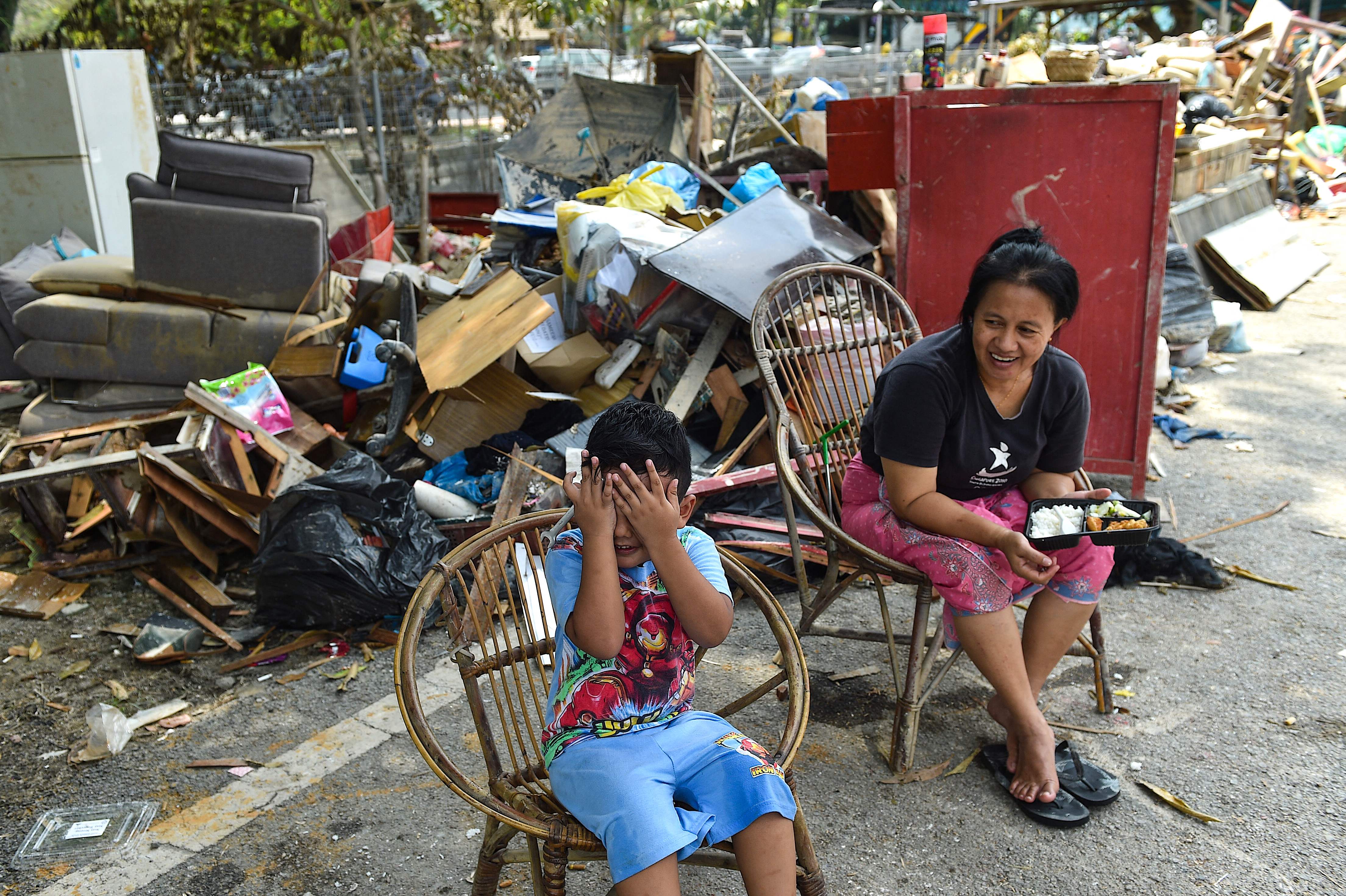 Residents of Taman Sri Muda sit beside debris collected after recent floods in Shah Alam, Selangor, on Dec 27, 2021.