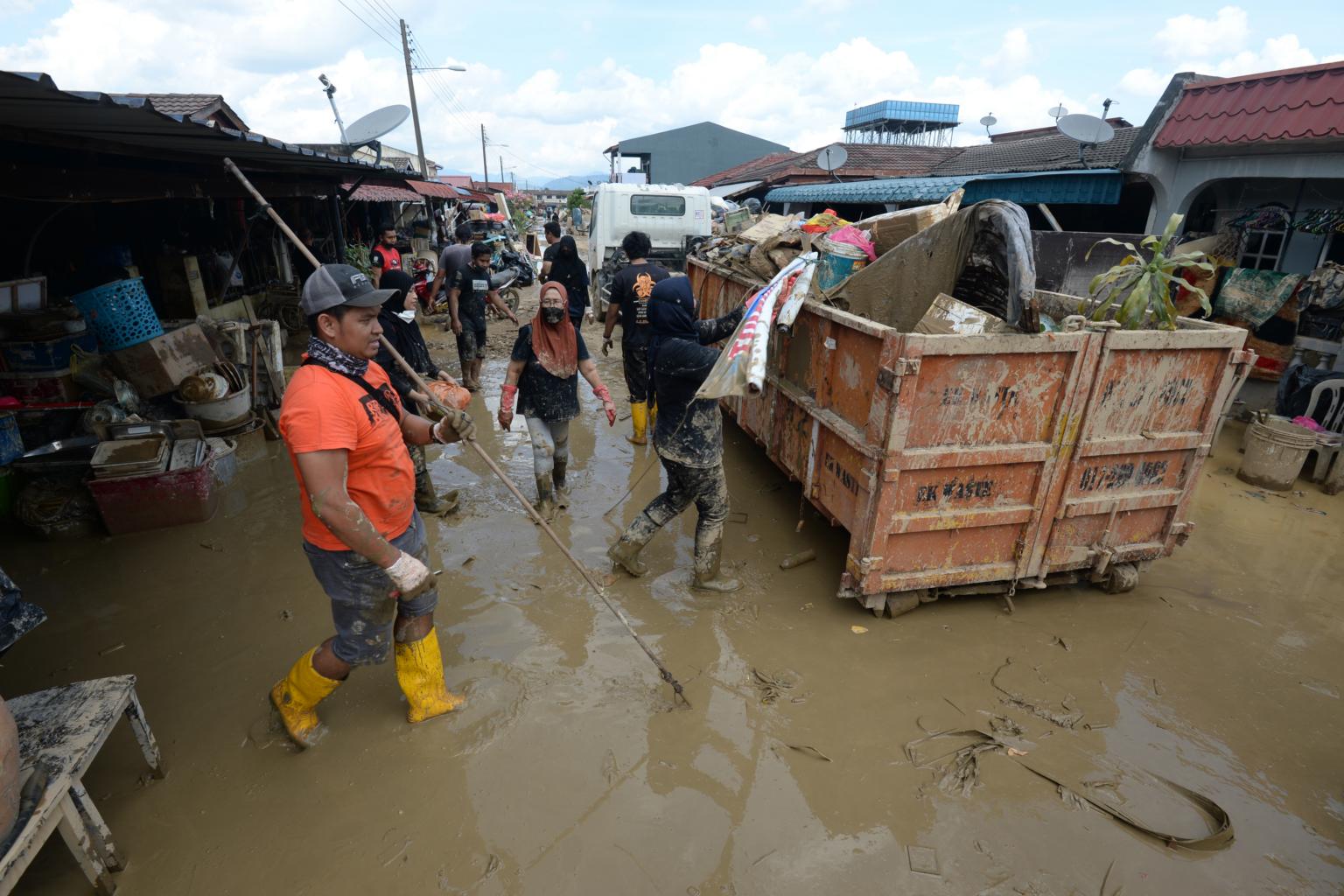 Volunteers help to clear the debris from the flood in Hulu Langat, Selangor, on Dec 25, 2021.