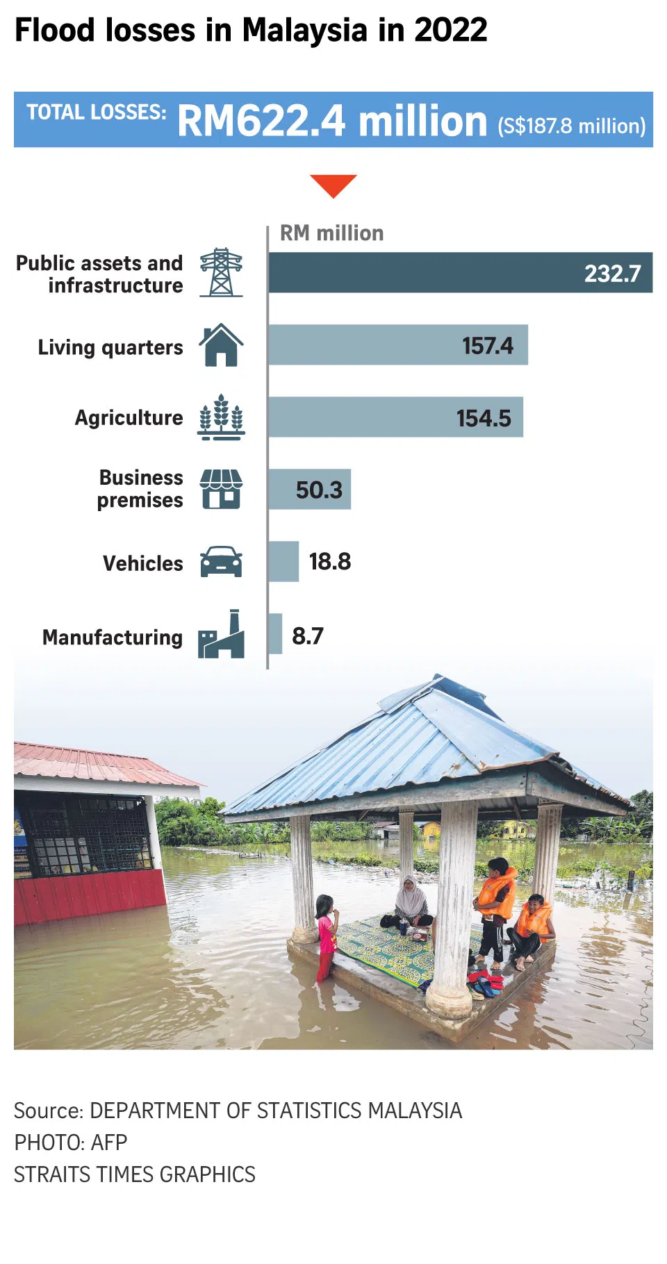 Malaysia logged RM622.4 million (S$187.8 million) in losses due to floods in 2022, with the east coast states of Terengganu and Kelantan racking up nearly 60 per cent of the losses.