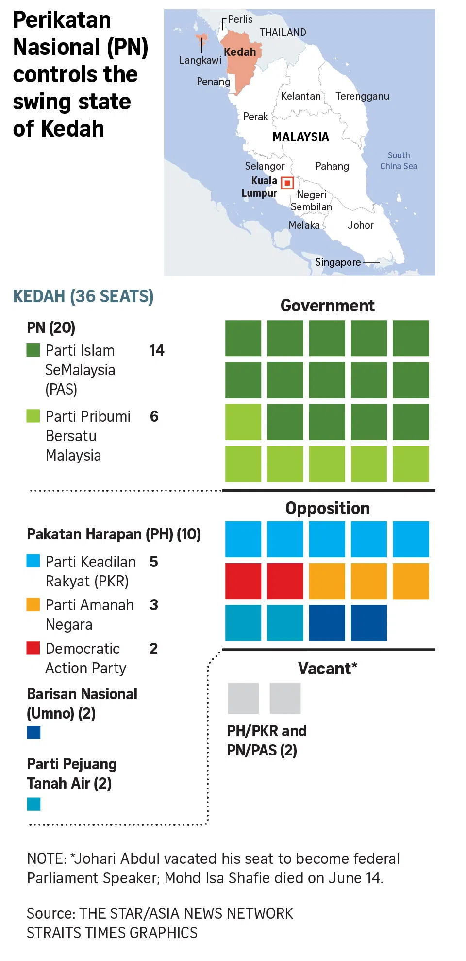 PN component parties Parti Islam SeMalaysia and Bersatu controlled Kedah with 20 seats in the 36-seat assembly that was recently dissolved.