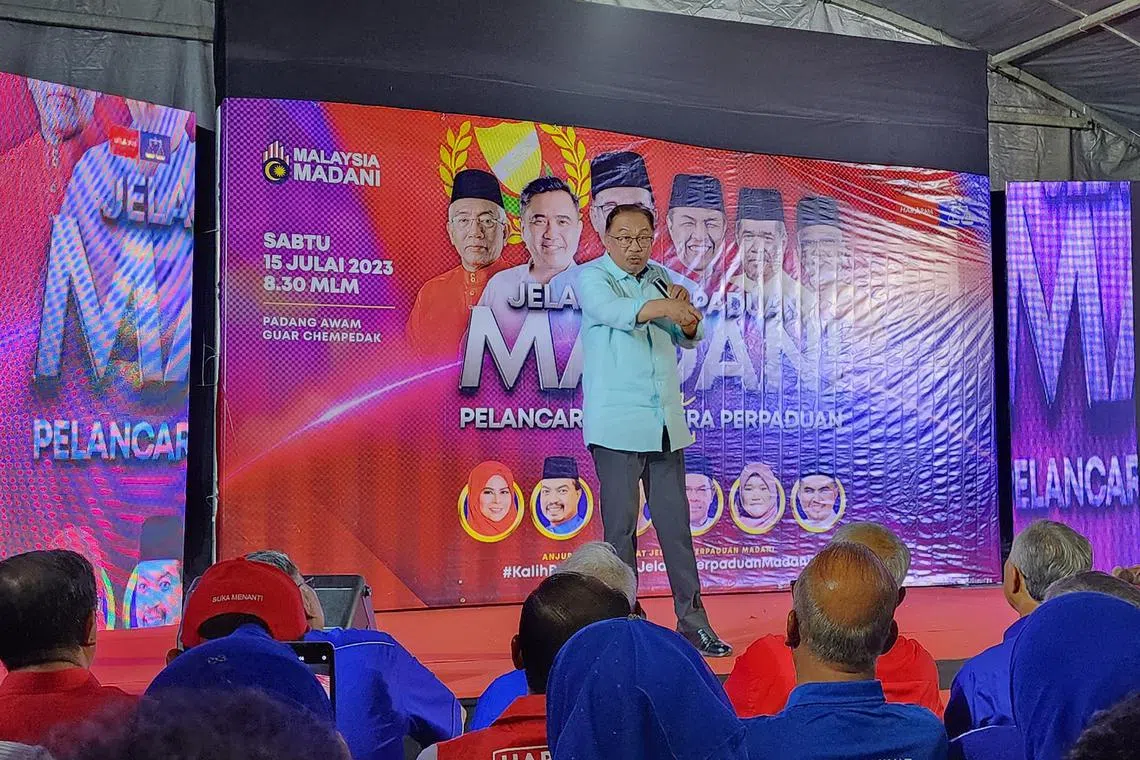 Malaysia PM Anwar Ibrahim at the launch of the unity government’s election machinery in Guar Chempedak, Kedah on July 15.