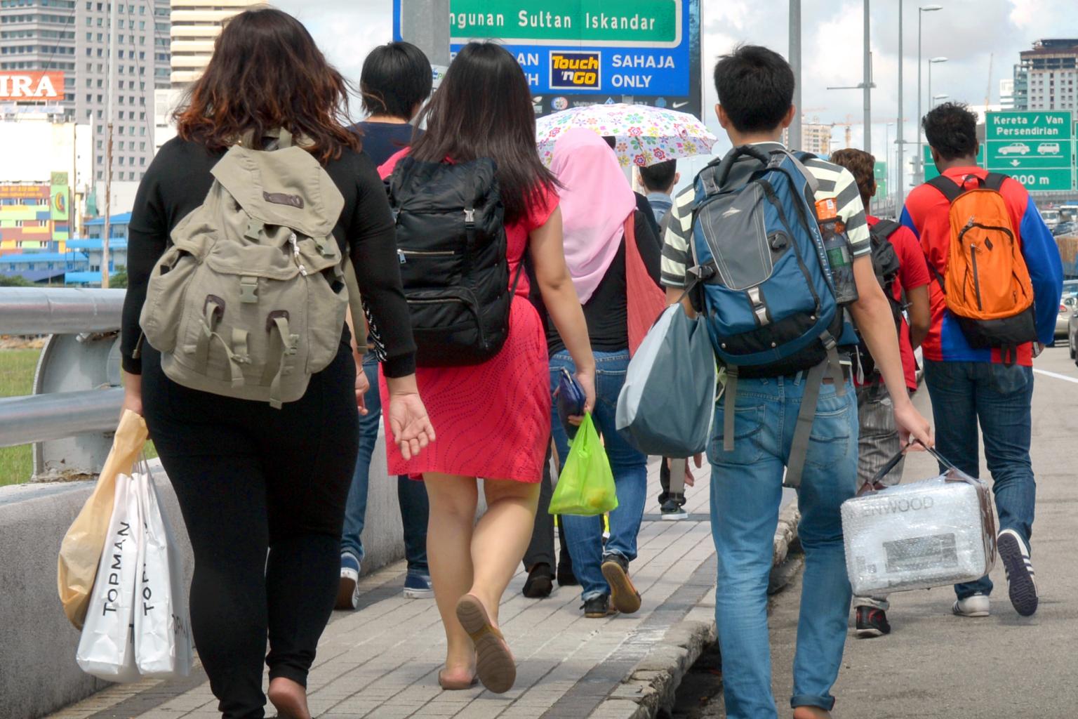 File photo showing people carrying shopping bags while walking beside a congested road in Johor Baru.