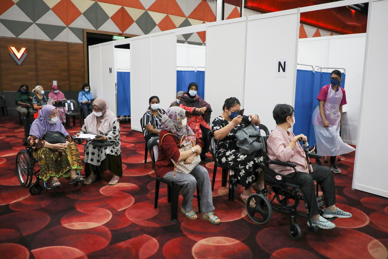 People wait to receive a vaccine at a vaccination centre in Subang Jaya, Malaysia, on April 26, 2021.