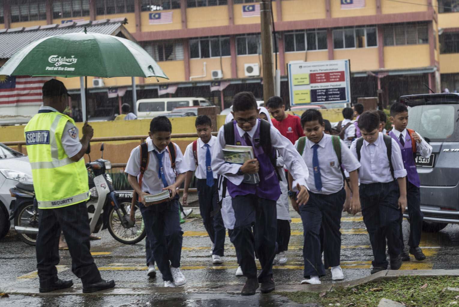 Malaysian students walk out from a school in rain after morning classes in Kuala Lumpur, Malaysia, on March 22, 2016.
