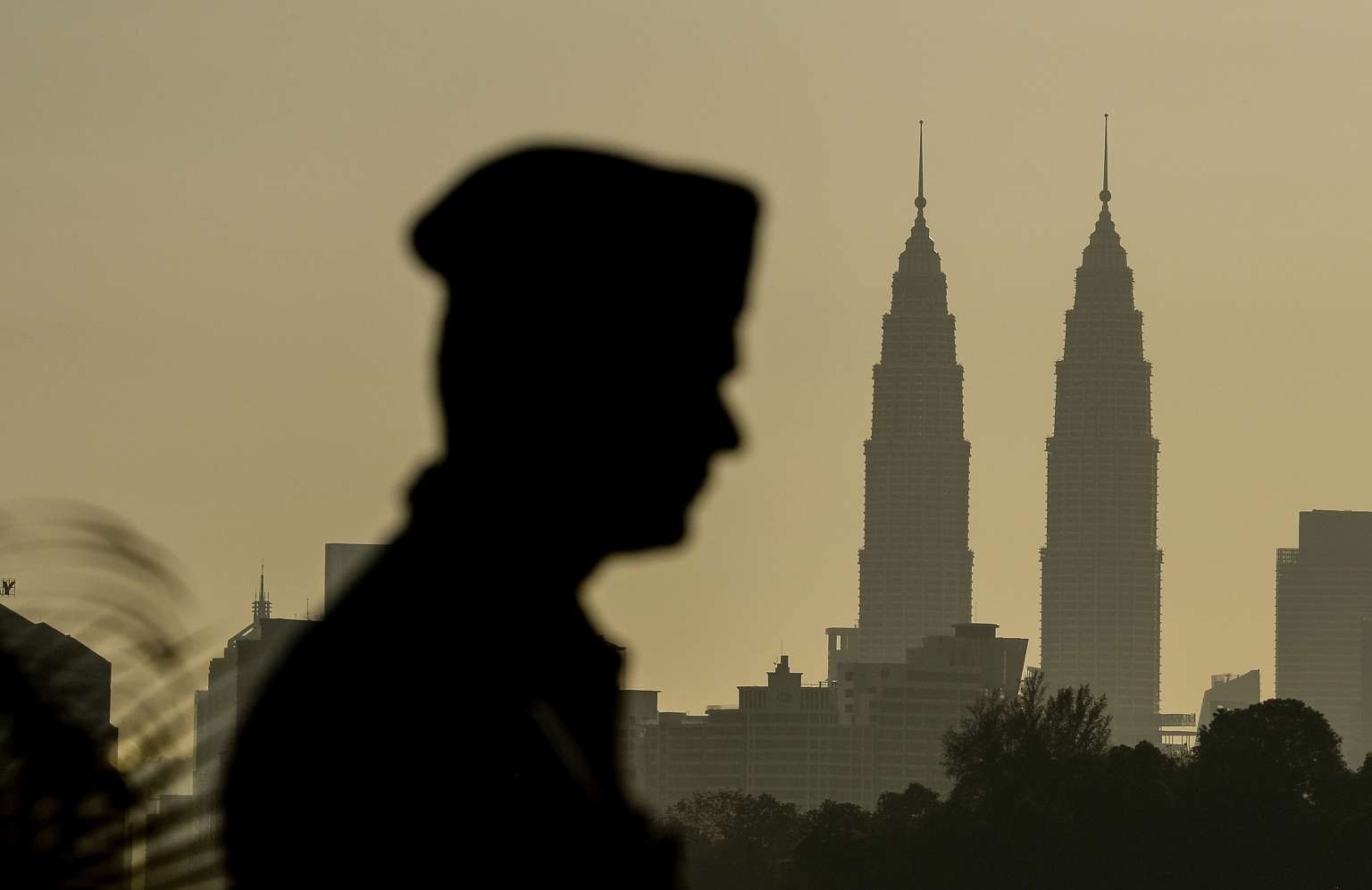 A security guard walks past Malaysia's iconic Twin towers in Kuala Lumpur.