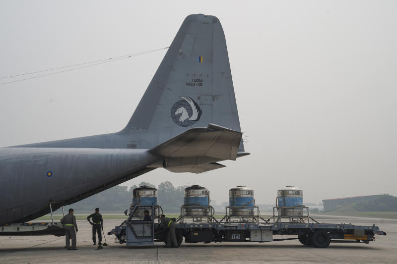 Tanks containing a solution of water and salt are loaded into a military plane at Subang Military Airbase on Sept 19, 2019, as part of a cloud-seeding operation to induce rain to ease the haze problem.