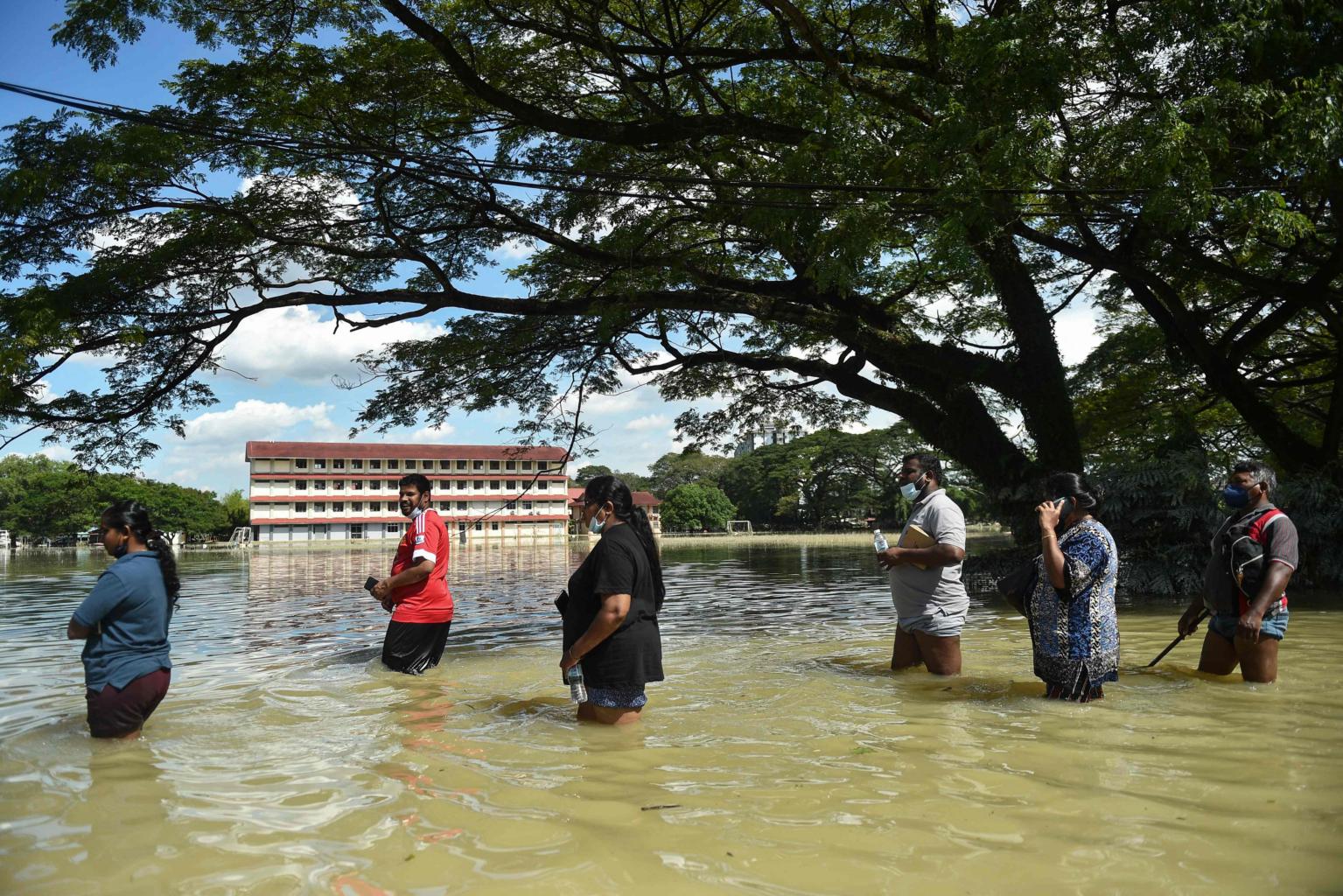 People wading through flood waters in Shah Alam, Selangor on Dec 21, 2021.