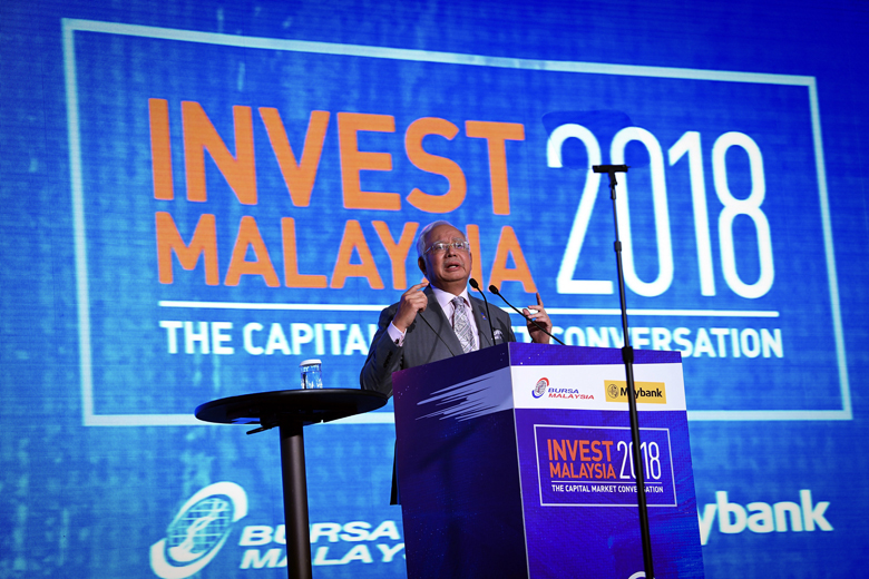 Malaysian Prime Minister Najib Razak giving the opening speech at the Invest Malaysia 2018 conference on Jan 23.
