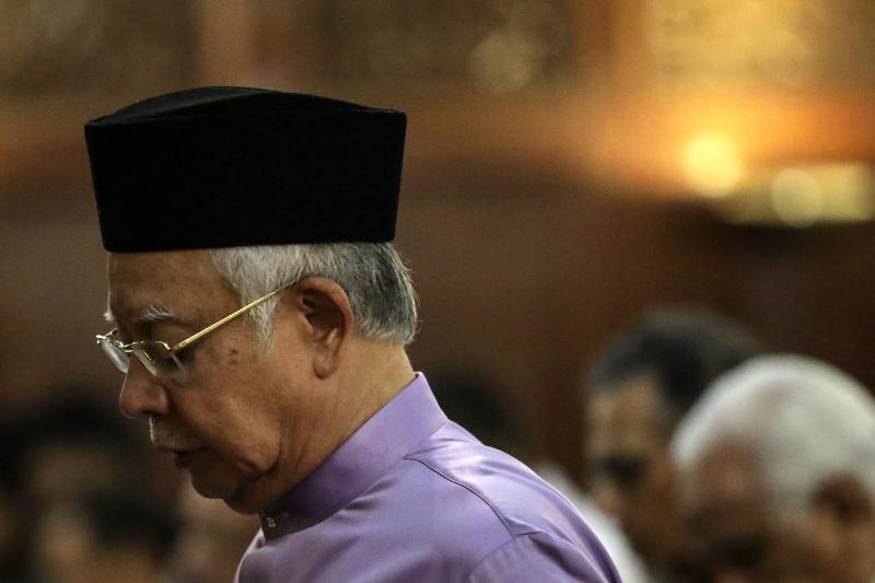 Former Malaysia prime minister Najib Razak reacts during Friday prayers in Kuala Lumpur, on May 18, 2018.