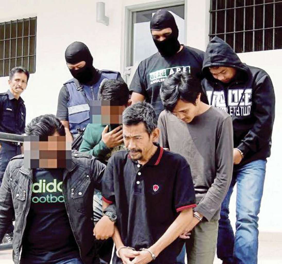 Mohd Syafrein Rasid (second from left) and Mohamad Yusoffe Ishak (left) after they were detained by Malaysian police, along with fellow suspect Mohd Rosmadi Che Daud (front, centre).