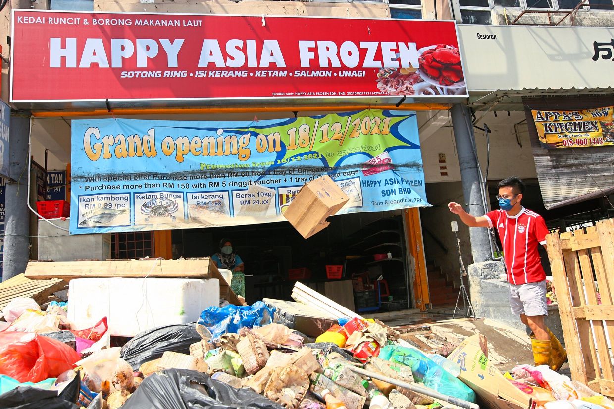 Seafood distributor Kiu Wee Jen discarding items that were damaged during the floods in Shah Alam.