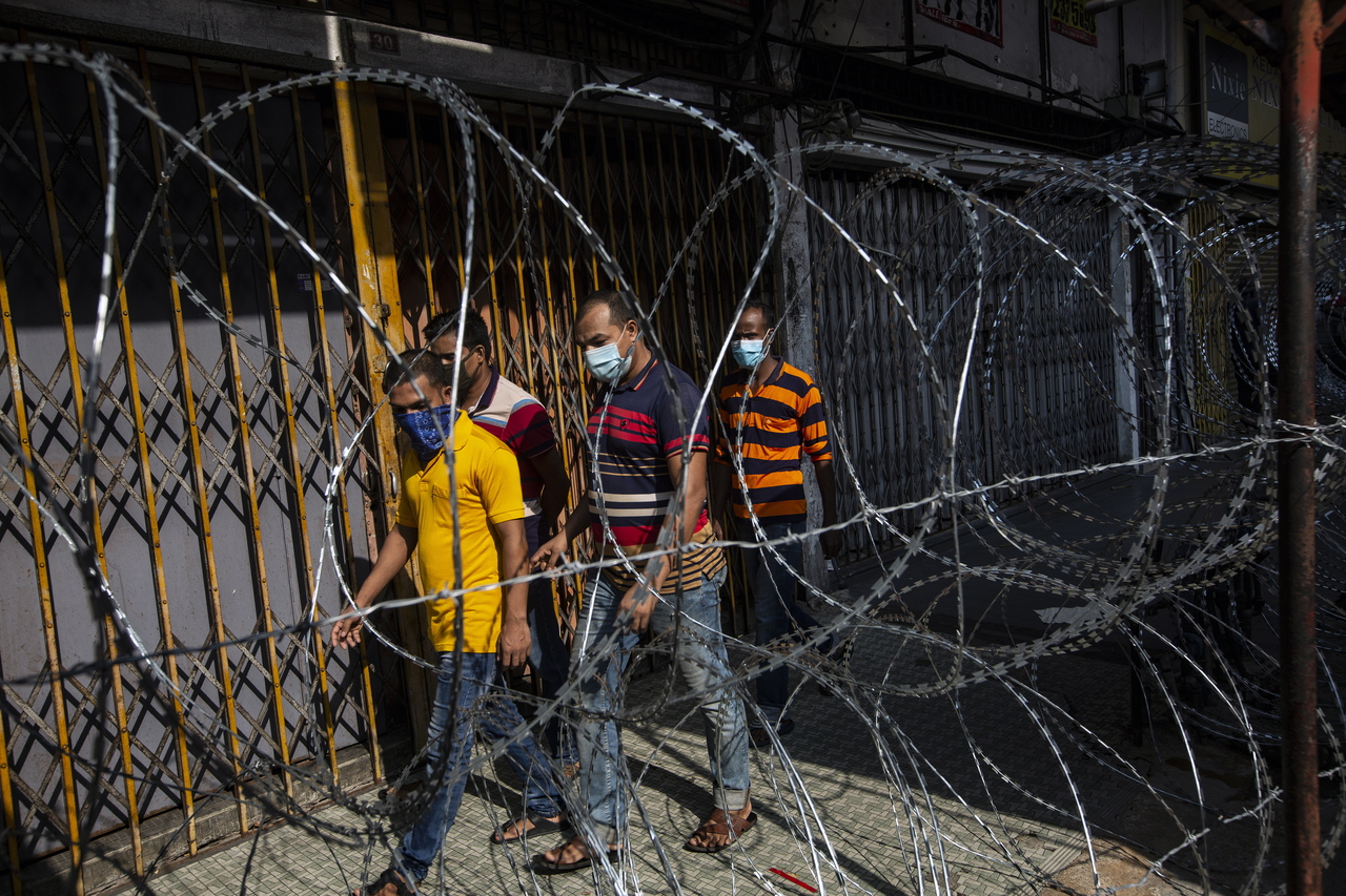 Migrant workers walk inside a locked down area in Kuala Lumpur, Malaysia, on May 15, 2020.