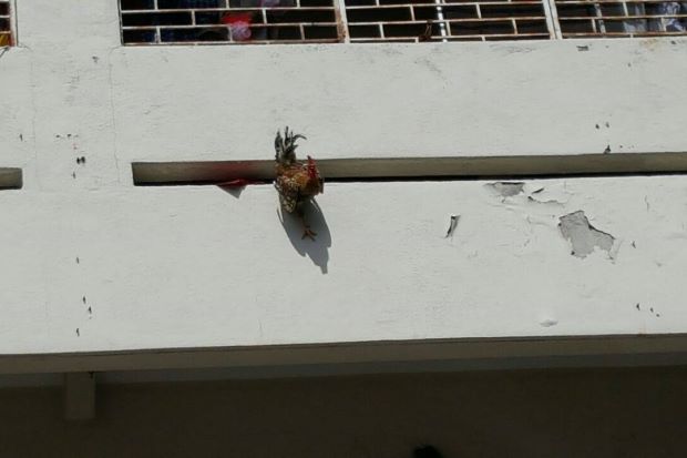 The rooster perched precariously in a narrow gap near a window on the third storey of a building on Jan 8, 2017.