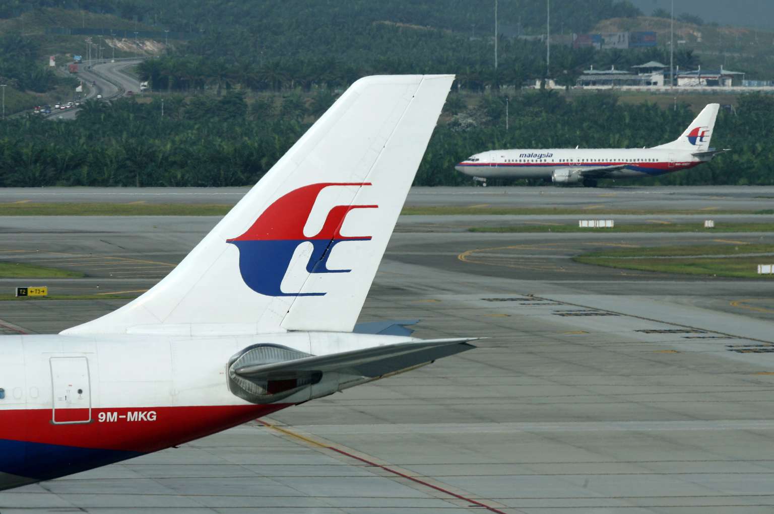 A Malaysian Airlines airplane is parked on the tarmac while another prepares for takeoff, at Kuala Lumpur International Airport.