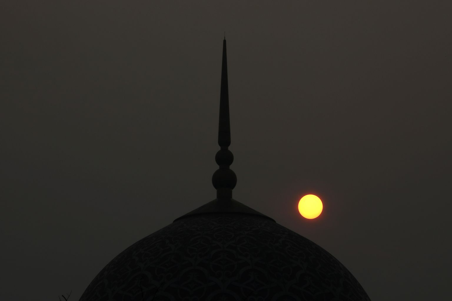 In a photo taken on Sept 17, 2019, the sun sets above a mosque on a hazy day in Putrajaya, Malaysia.