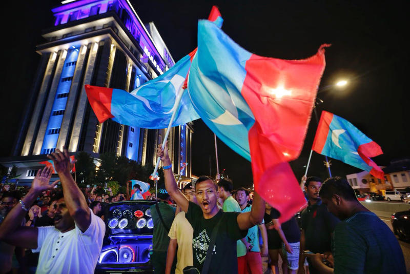 Supporters of Pakatan Harapan (PH) celebrating outside Majlis Bandaraya Iskandar Puteri, Johor Baru in the early morning of May 10, 2018, after PH defeated the Umno-led Barisan Nasional in Malaysia's 14th General Election.