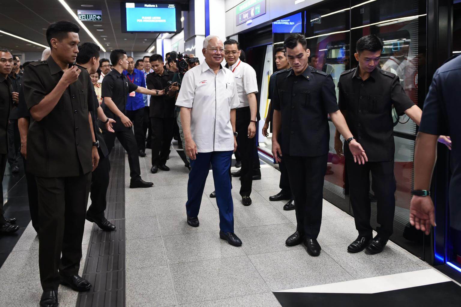 Malaysia's Prime Minister Najib Razak (centre) walks along the platform before boarding a Malaysia Mass Rapid Transit (MRT) train during the official launch of the MRT Sungai Buloh-Kajang (SBK) rail line in Kuala Lumpur on July 17, 2017.