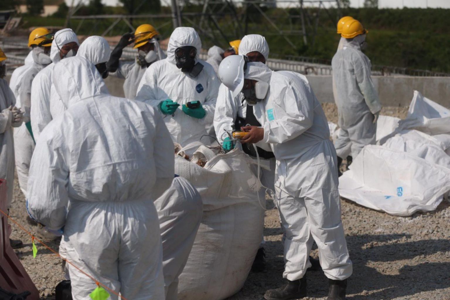 Personnel from the Emergency Medical Services and the military take soil samples along a site that is believed to have been the area where chemical waste was dumped in Pasir Gudang, Johor, on March 14, 2019.
