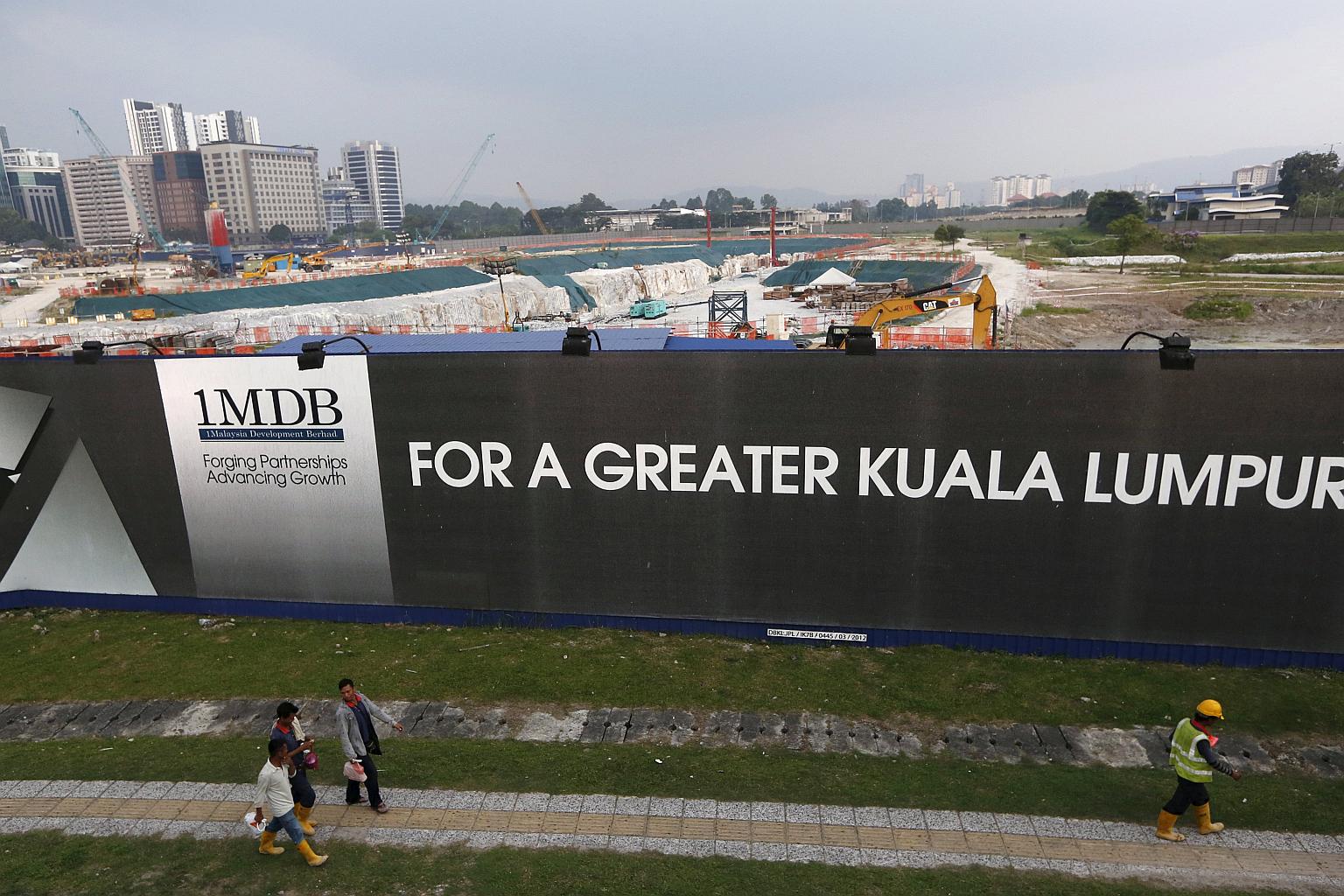 Men walking past a 1MDB billboard in Kuala Lumpur, Malaysia.