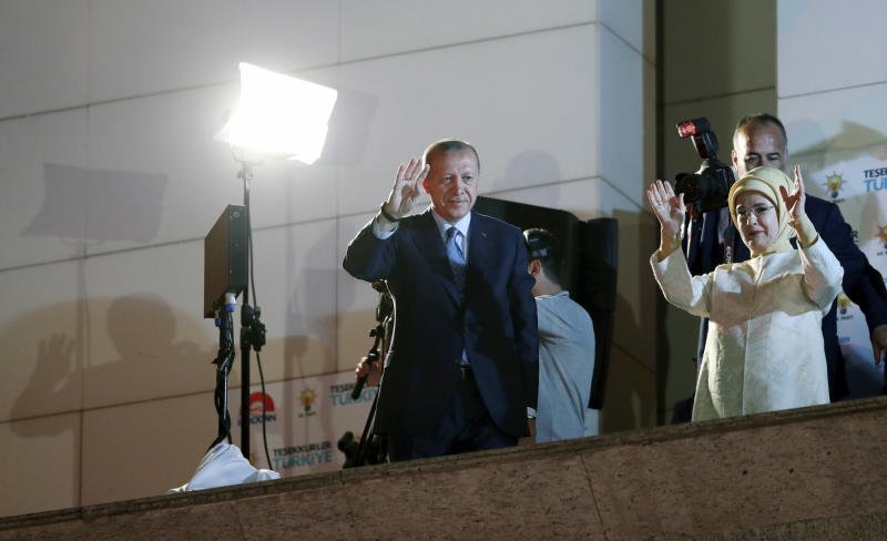 Turkish President Recep Tayyip Erdogan and his wife wave to supporters in Ankara, on June 24, 2018.