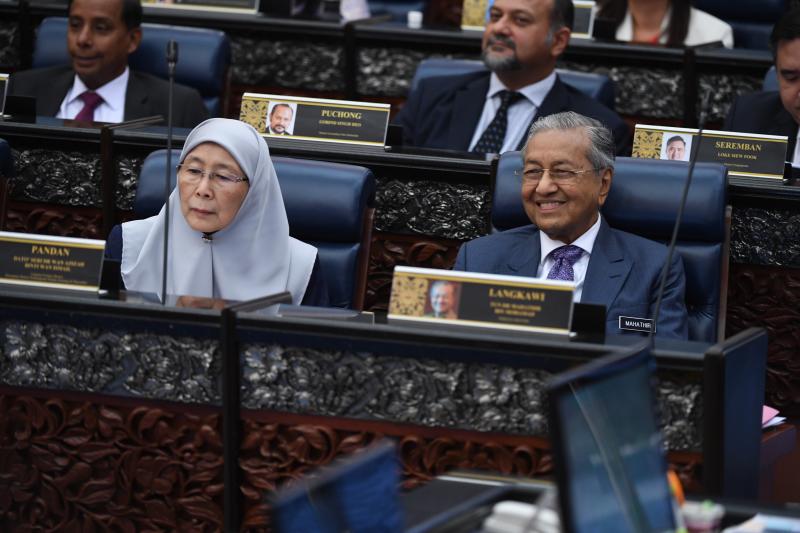 A photo taken on Oct 11 shows Malaysian Deputy Prime Minister Wan Azizah Wan Ismail and Prime Minister Mahathir Mohamad during the 2020 budget presentation at the Parliament House in Putrajaya.