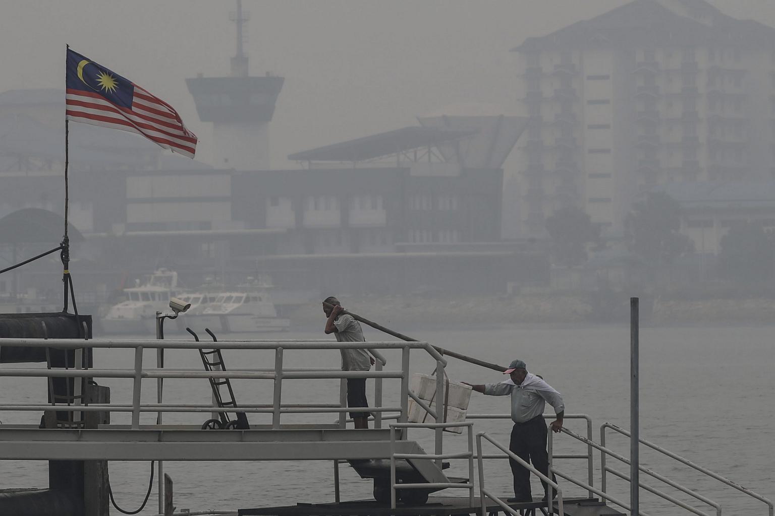 Workers shrouded by haze in Port Klang, outside Kuala Lumpur, Malaysia, Oct 5, 2015.