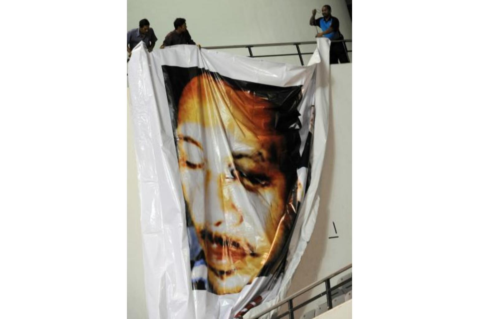 Supporters of Anwar Ibrahim hanging a poster of him at a rally in Selangor state on July 1, 2008, showing a black eye inflicted in a severe beating by former Malaysian police chief Abdul Rahim Noor.