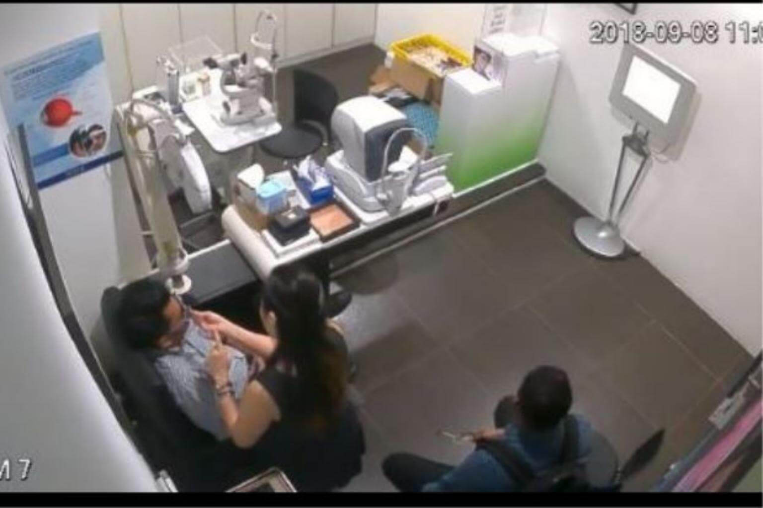 In the short clip, the officer, seated next to the minister who was having his eyes tested, was caught surreptitiously slipping his camera under the woman's skirt while she was busy with the examination.