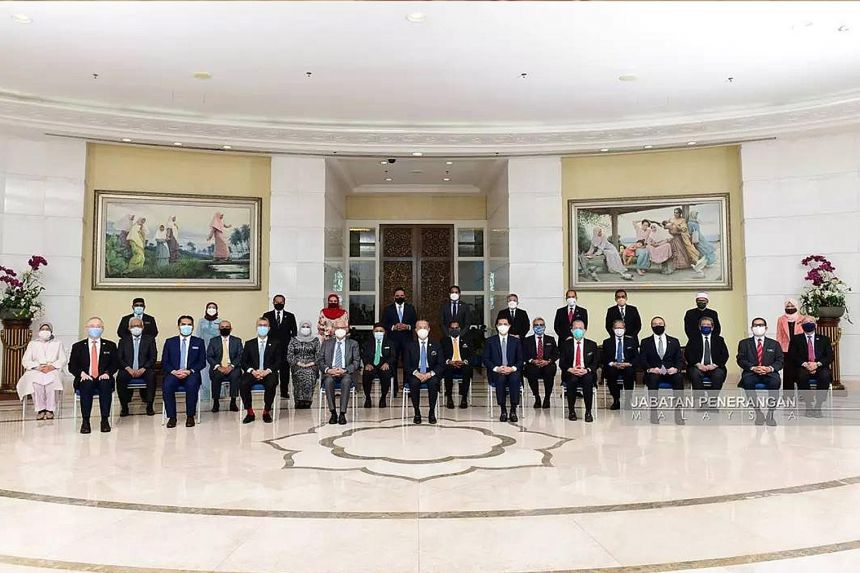 Outgoing prime minister Muhyiddin Yassin (front row, centre) with his Cabinet ministers at the Perdana Putra building in Putrajaya on Aug 16, 2021.