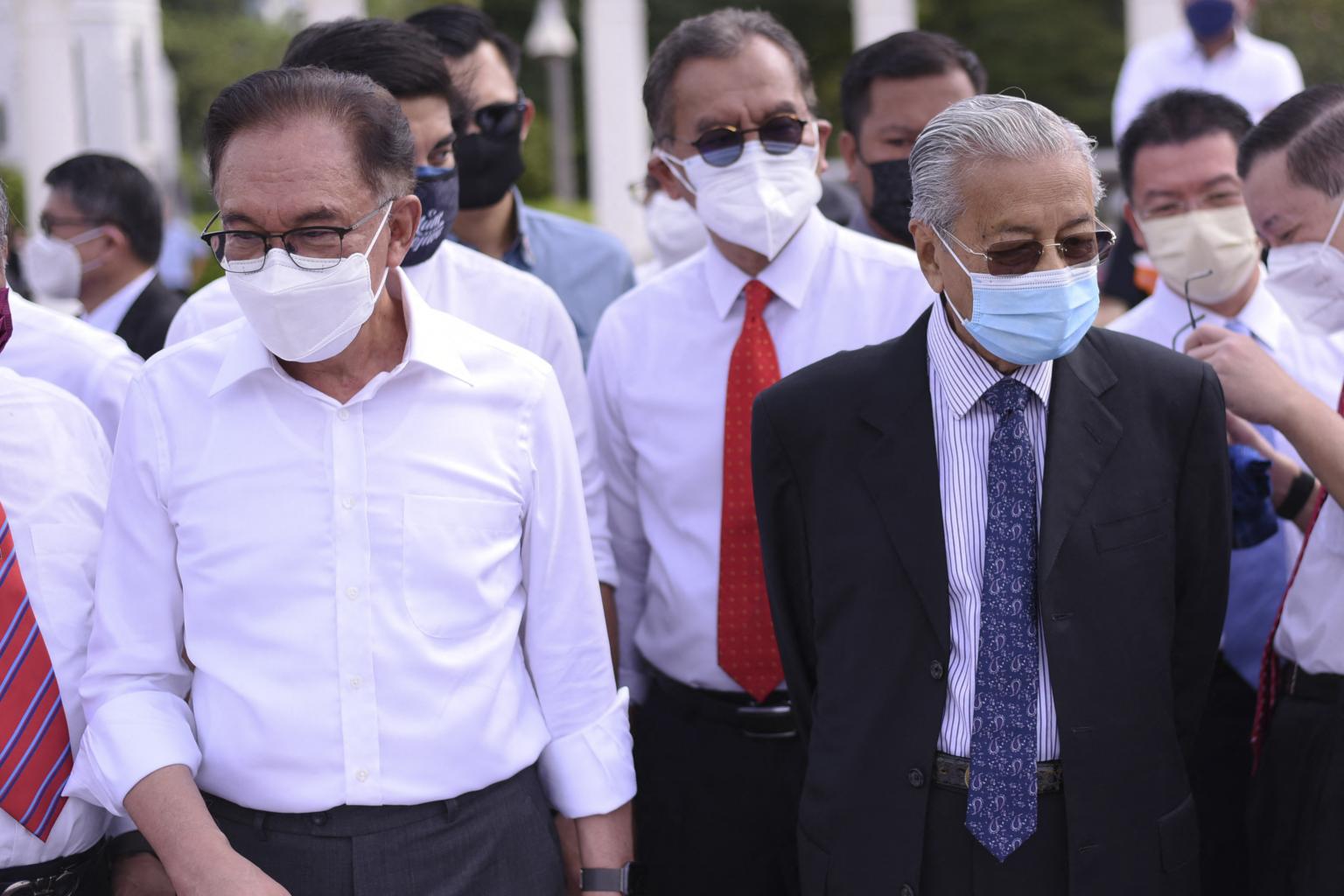 Mr Anwar Ibrahim (left) and Mr Mahathir Mohamad at the opposition protest against the closure of parliament in Kuala Lumpur, on August 2, 2021.