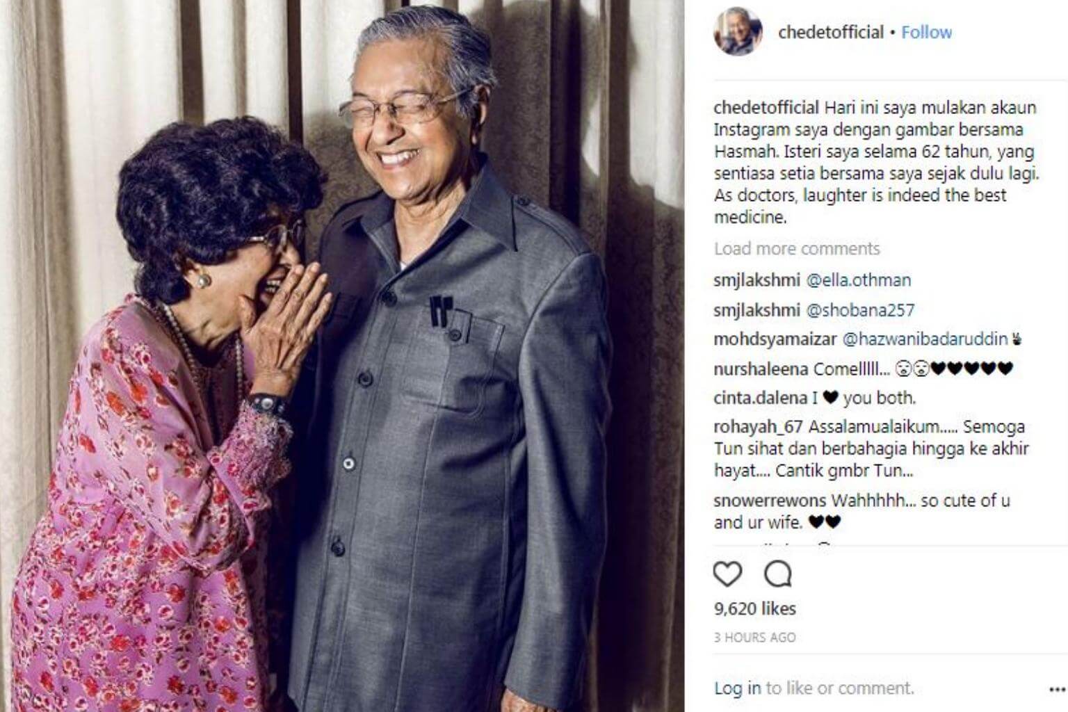 Malaysia's former Prime Minister Mahathir Mohamad launched his account chedetofficial by posting a photo of his wife Tun Dr Siti Hasmah Mohd Ali and him laughing together.