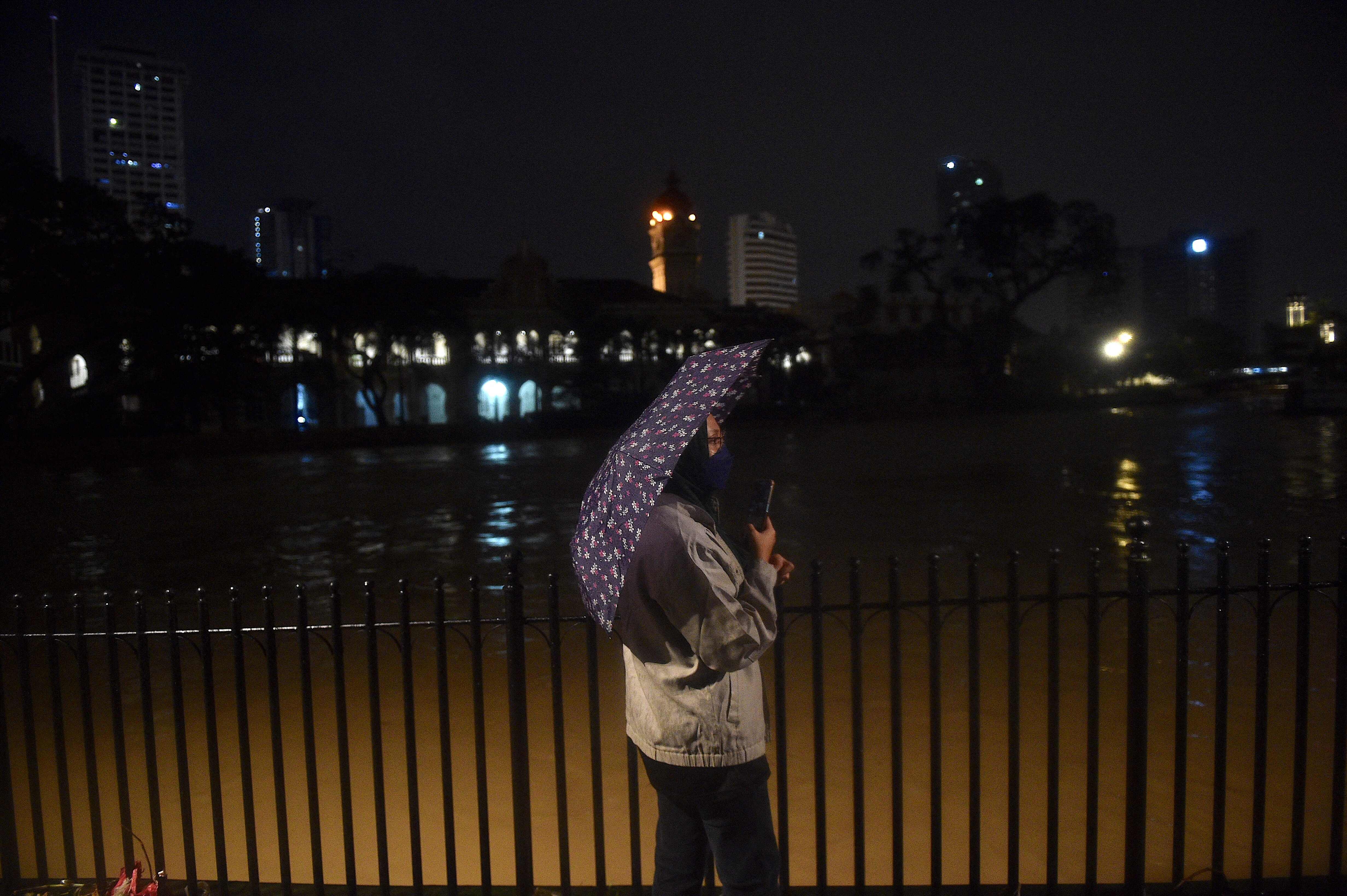 A woman stands next to the swollen Klang river caused by heavy rain in Kuala Lumpur on Dec 19, 2021.