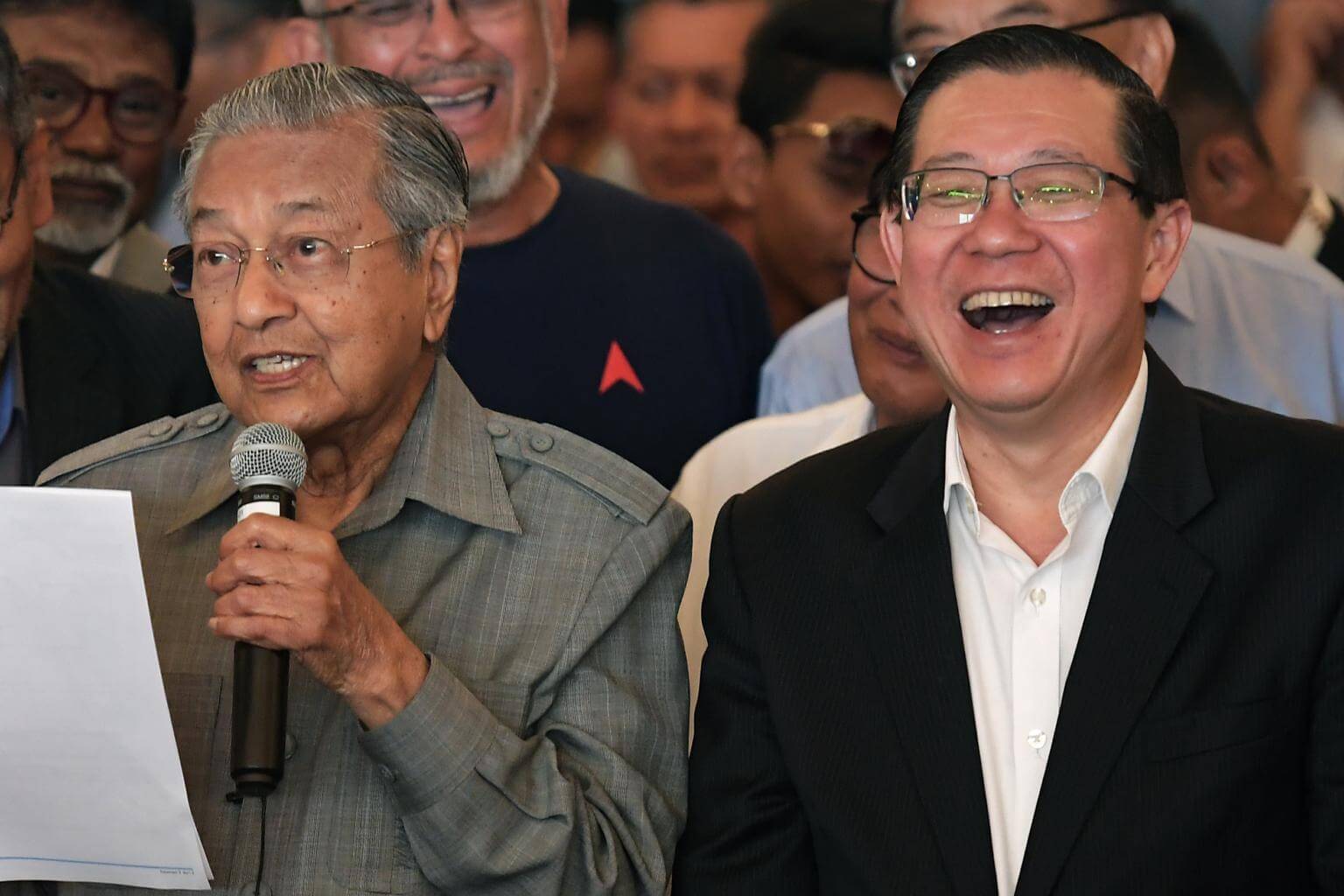 Malaysian Prime Minister Mahathir Mohamad (left) and Finance Minister Lim Guan Eng attending a press conference at the Sheraton Petaling Jaya Hotel on May 10, 2018.