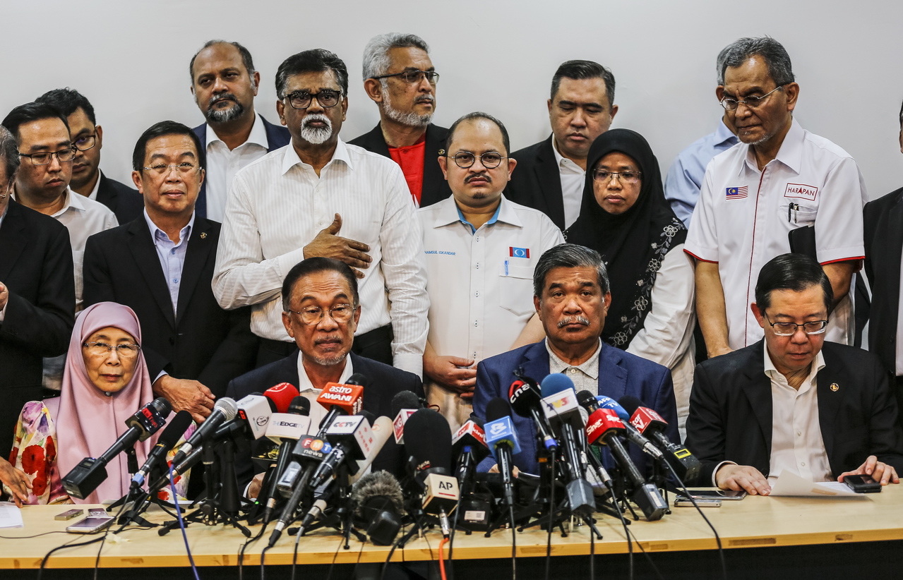 <p>epa08249028 Malaysia's President of the People's Justice Party and leader of Pakatan Harapan coalition, Anwar Ibrahim (2-L) speaks at the Pakatan Harapan press conference in Kuala Lumpur, Malaysia, 26 February 2020. According to reports, the Pakatan Harapan coallition has backed Ibrahim for the post of the Prime Minister after Mahathir Mohamad has resigned as Malaysian prime minister on 24 February. EPA-EFE/AHMAD YUSNI</p>