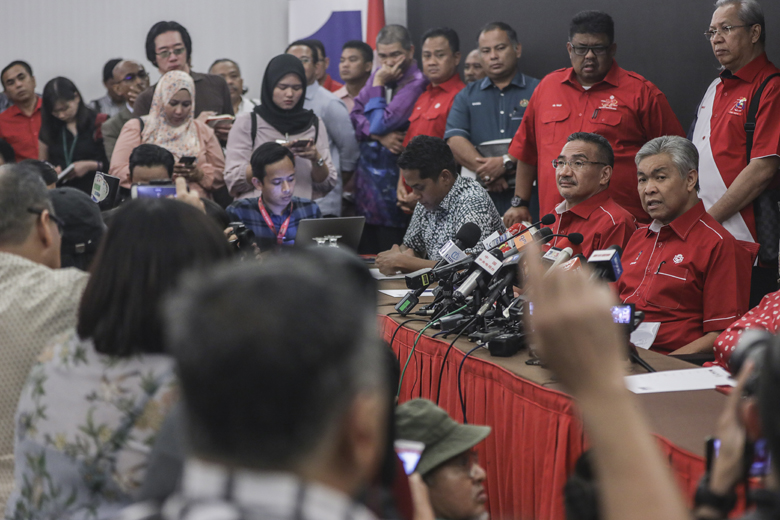 Umno's acting president Ahmad Zahid Hamidi (right) speaks during a press conference in Kuala Lumpur on May 14, 2018.