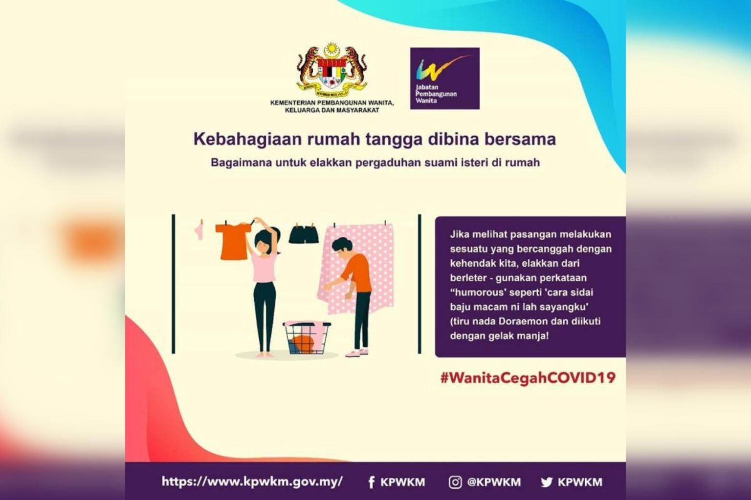 In a series of Facebook posts, the Malaysian women's ministry offered tips for how wives should behave during the current movement control order period as a result of the coronavirus pandemic.